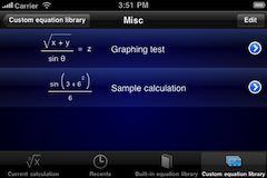 When you are are in the custom library view, you can browse, load, and edit the equations stored within the user-defined categories. Tap on a category to see the equations stored within it.