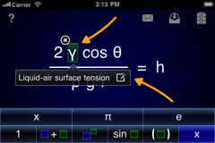 Once you have loaded an equation, you can work with it as you would for any standard mathematical calculation. Tapping on a variable will bring up a label that describes the purpose of that variable. This can serve as a useful reference or memory aid.